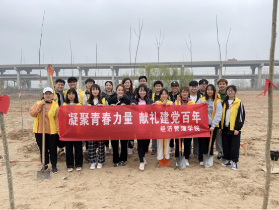 植树现场,红色党旗迎风飘扬,党员师生个个奋勇争先。大家肩扛树苗、挥锹挖坑、扶正树干、填埋新土、踩实土壤,两人一组相互协作、相互配合,严格按照“三埋两踩一提苗”的方法合力栽下一棵棵树苗,展现出一片热火朝天的劳动场景。看到一株株树苗巍然屹立于黄河河畔,想着茁壮成长后变成一道靓丽的绿色风景,所有人的辛勤付出终将会收获绿色希望。参加植树的师生纷纷表示,要以实际行动践行习近平生态文明思想,为建设生态郑州、美丽郑州贡献一份力量。